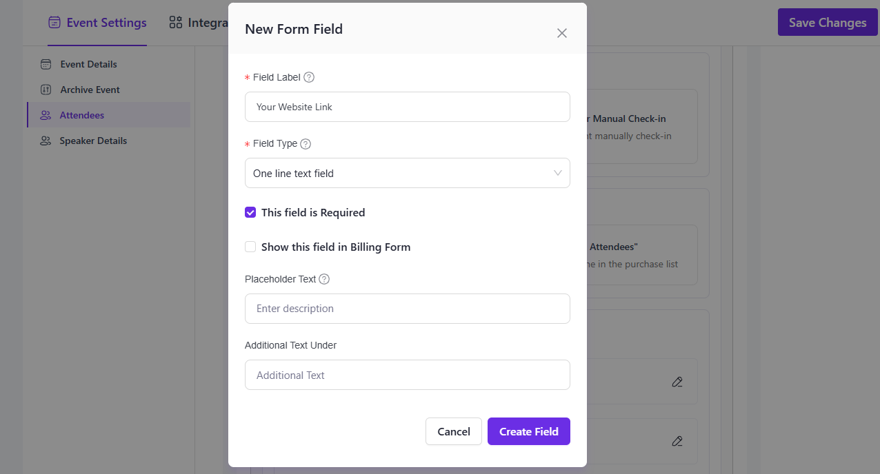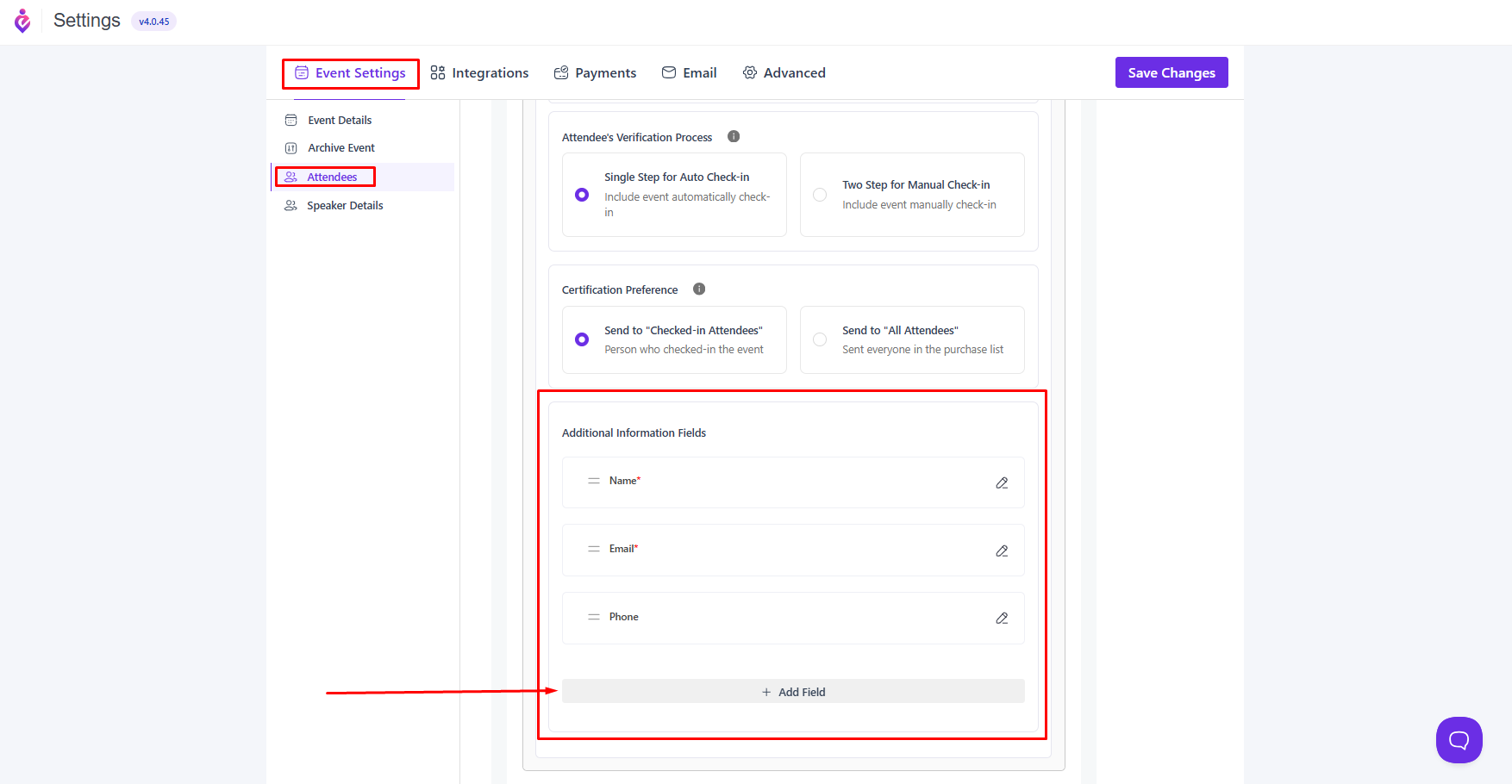- Go to Eventin > Settings > Event Settings > Attendees > Additional Information Fields.