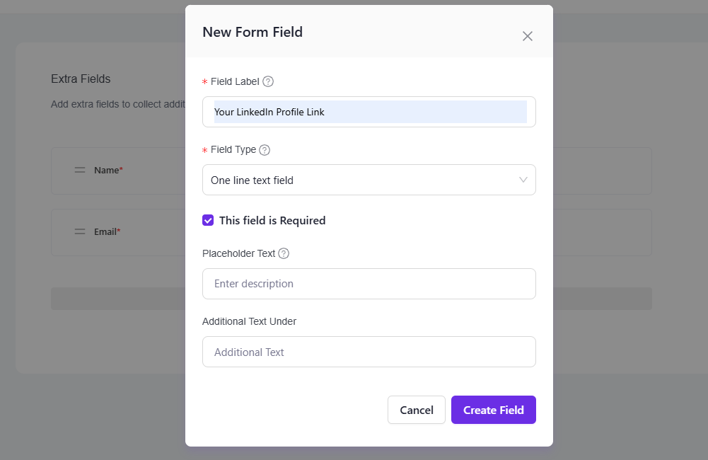 A popup will appear where you can set the field label, choose a field type such as text, number, dropdown, checkbox, or date, and decide if the field is required or optional.
