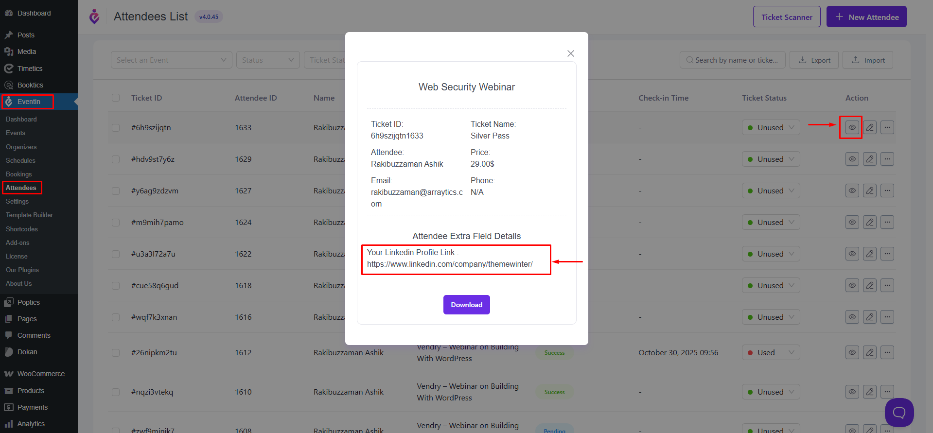 - Go to the Attendees dashboard in Eventin.