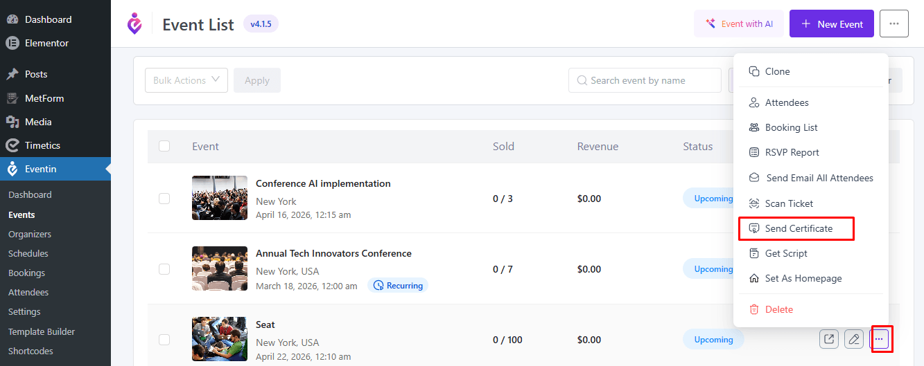 - After the event has ended, go to Eventin → Events. For the event you want to send certificates for, click the More Actions (three dots) button, then select Send Certificate.