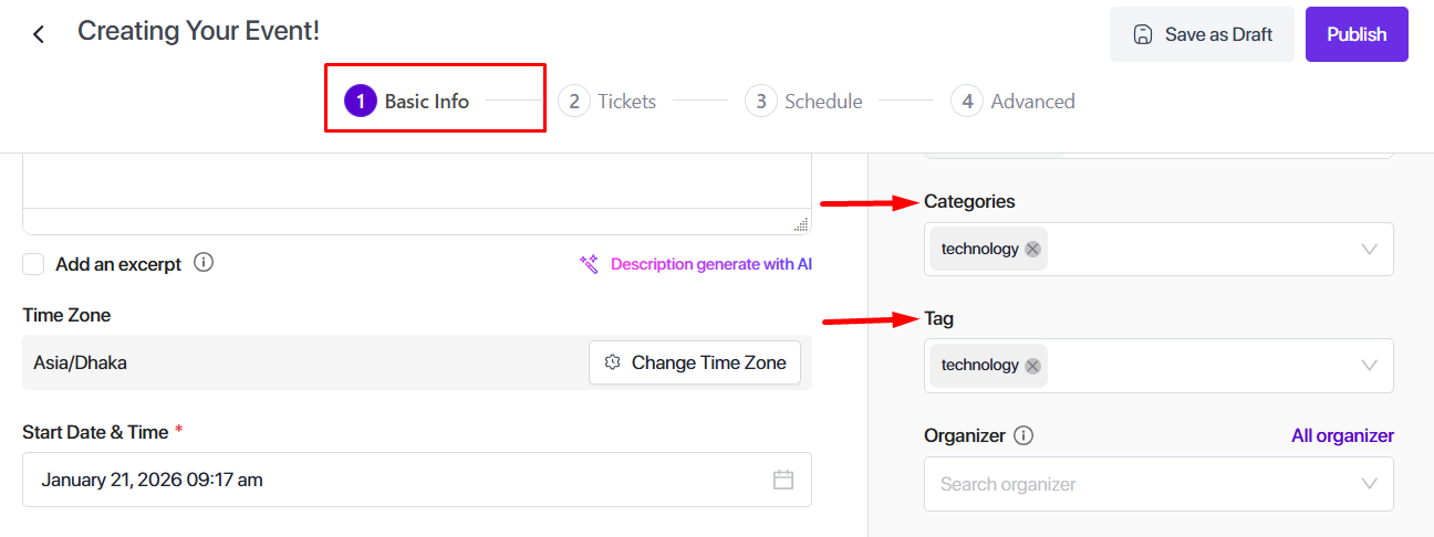 To add categories and tags, create or edit an event and select categories and tags for your event. You can choose multiple categories and tags for your event if you want.