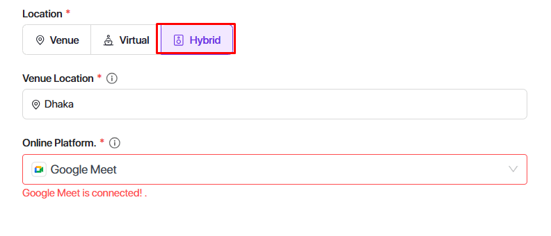 With Eventin, you can add both a venue location for physical attendees and an online meeting link (Google Meet, Zoom, or a custom link) for virtual participants. Ticket buyers automatically receive the correct details via email, making the experience smooth for both organizers and attendees.