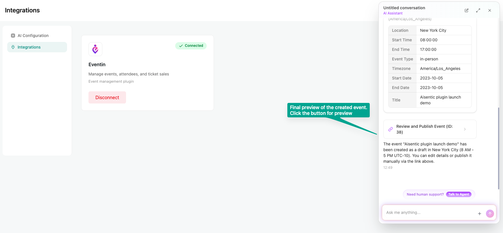 The AI will process your request and create the event in Eventin. You’ll receive a success message along with a direct link to view the newly created event.