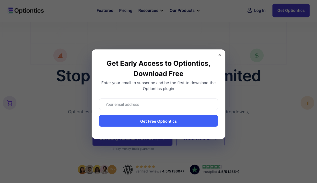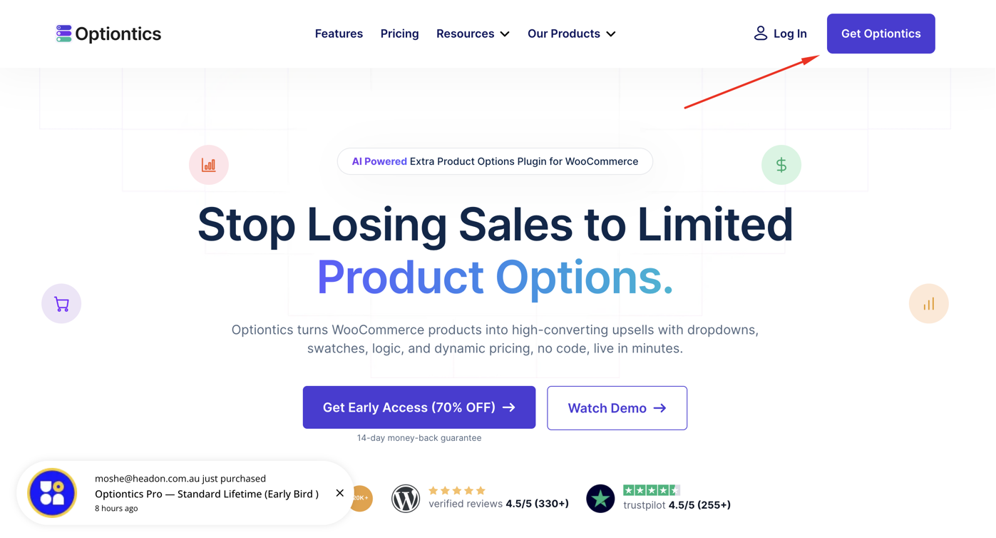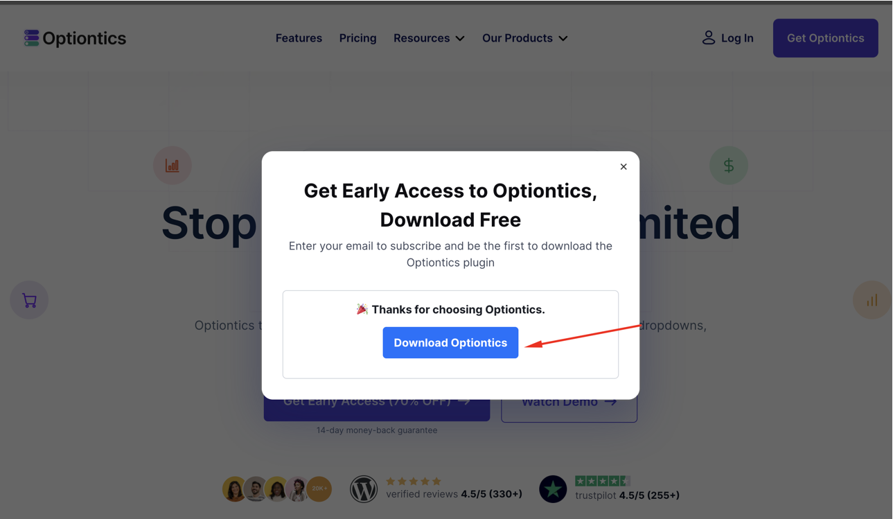 First, go to the official Optiontics product page on the ThemeWinter website. On the top header section, you will see a “Get Optiontics” button. Click on this button to continue.