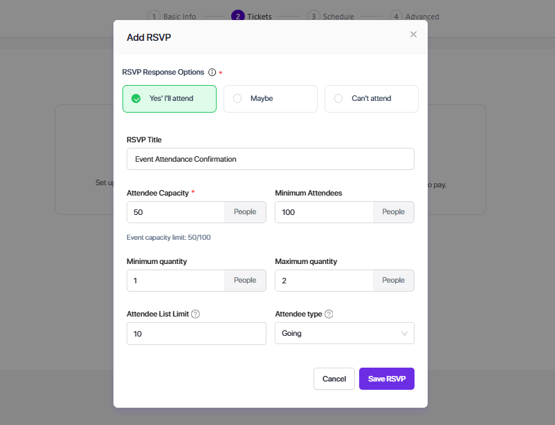 3. Set the attendee capacity by defining the maximum number of allowed participants.