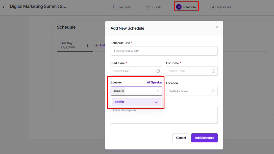 To assign a speaker to a schedule, create or edit any schedule, and assign single or multiple speakers for your schedule.