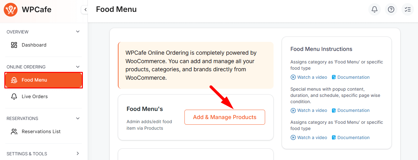 To create a new menu item, navigate to Food Menu → Add & Manage Product. This will redirect you to the WooCommerce Add New Food Menu page.