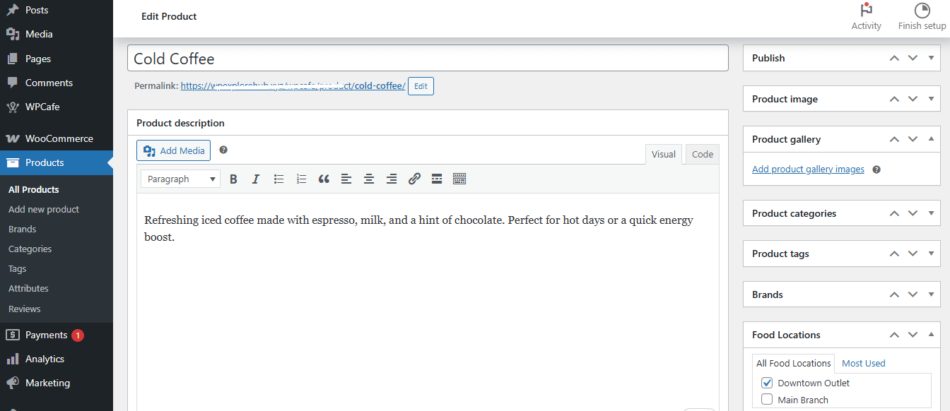 Managing your Food Menu in WPCafe is straightforward and flexible. By properly using categories, tags, brands, locations, and variations, you can keep your online shop organized and provide a smooth experience for your customers. Regularly updating and optimizing menu items ensures that your offerings stay current and engaging.
