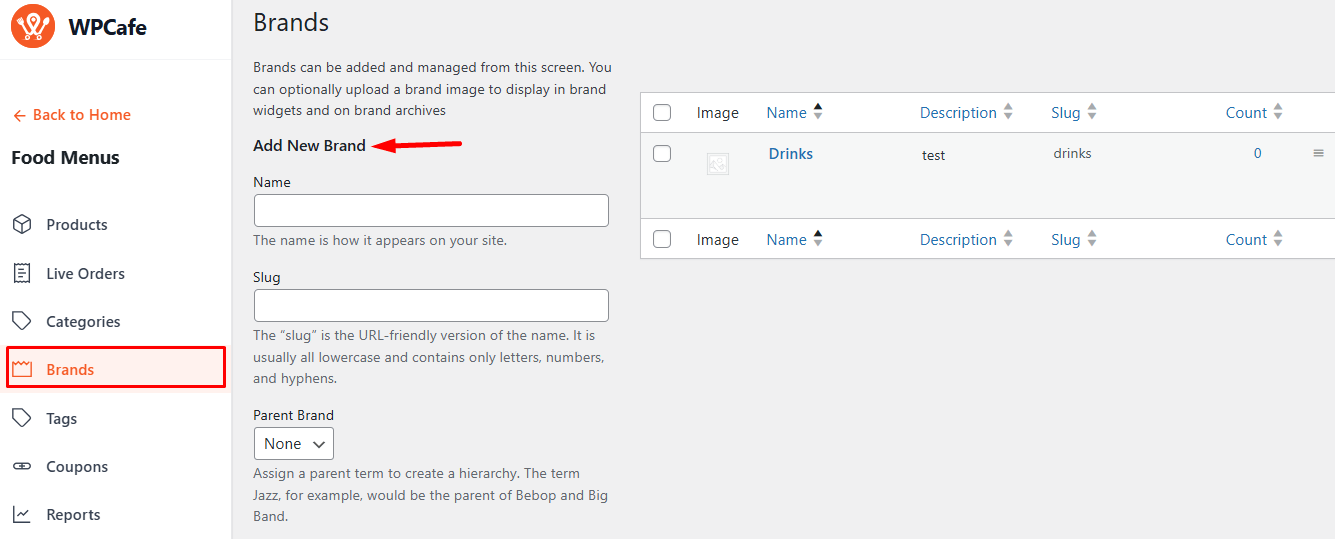In WPCafe, you can assign brands to your food items. By doing this, your products will be easily searchable and filterable by brand, helping customers quickly find items from their preferred brands.