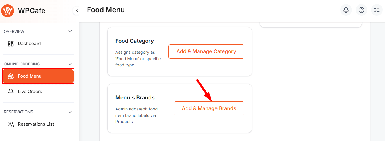 - Navigate to Food Menu → Food Brand → Add & Manage Brands.