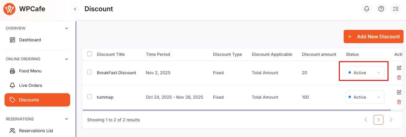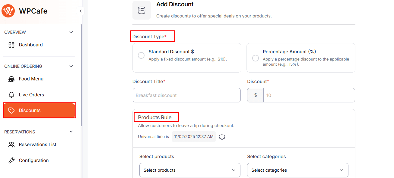 Offering discounts helps attract customers and promote special deals on your products. WPCafe allows you to create both fixed amount and percentage-based discounts.