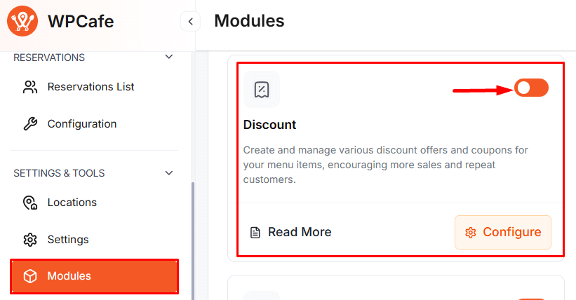 Go to WPCafe → Settings & Tools → Modules, then turn on the Discount module.