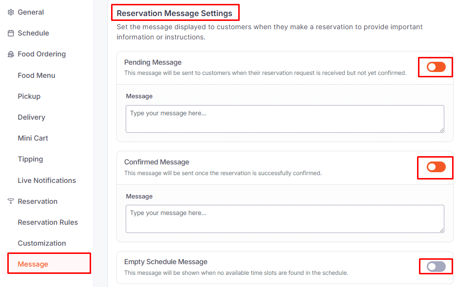 The Reservation Message Settings feature in WPCafe helps you maintain clear communication with customers throughout their booking journey.
