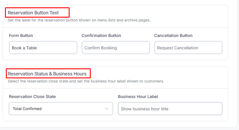 Absolutely. Under Reservation Button Text, you can change the text for the booking, confirmation, and cancellation buttons to match your restaurant’s branding and tone.