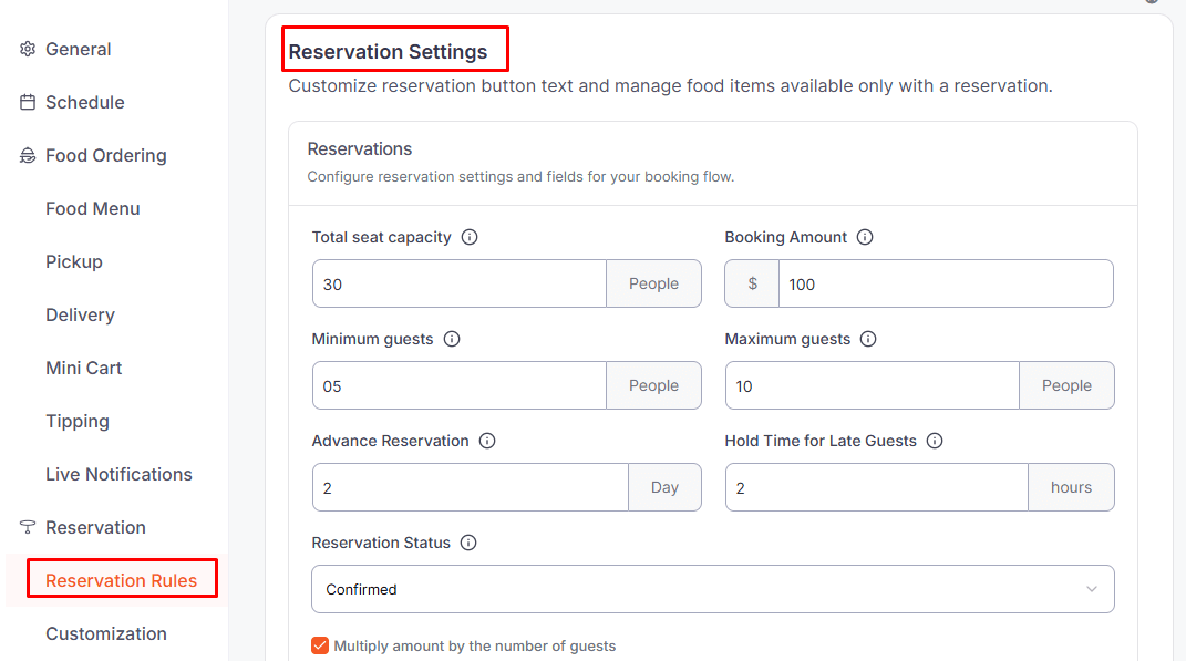 The Reservation Settings section in WPCafe allows you to manage how customers make reservations and how those reservations are handled inside your restaurant website.