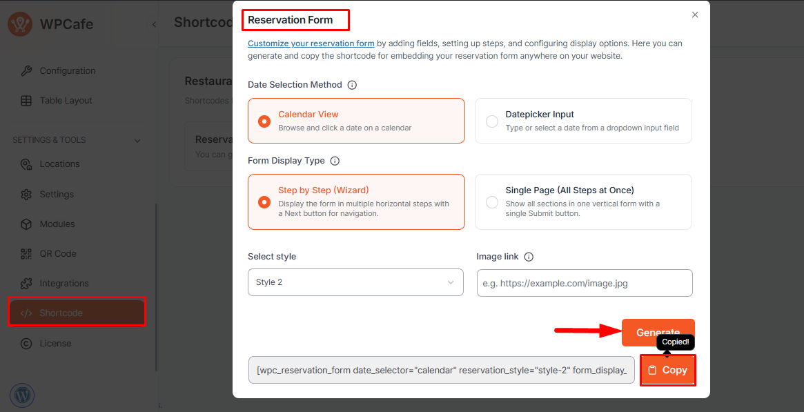 Once you click Generate, WPCafe will automatically create a shortcode based on your selections.