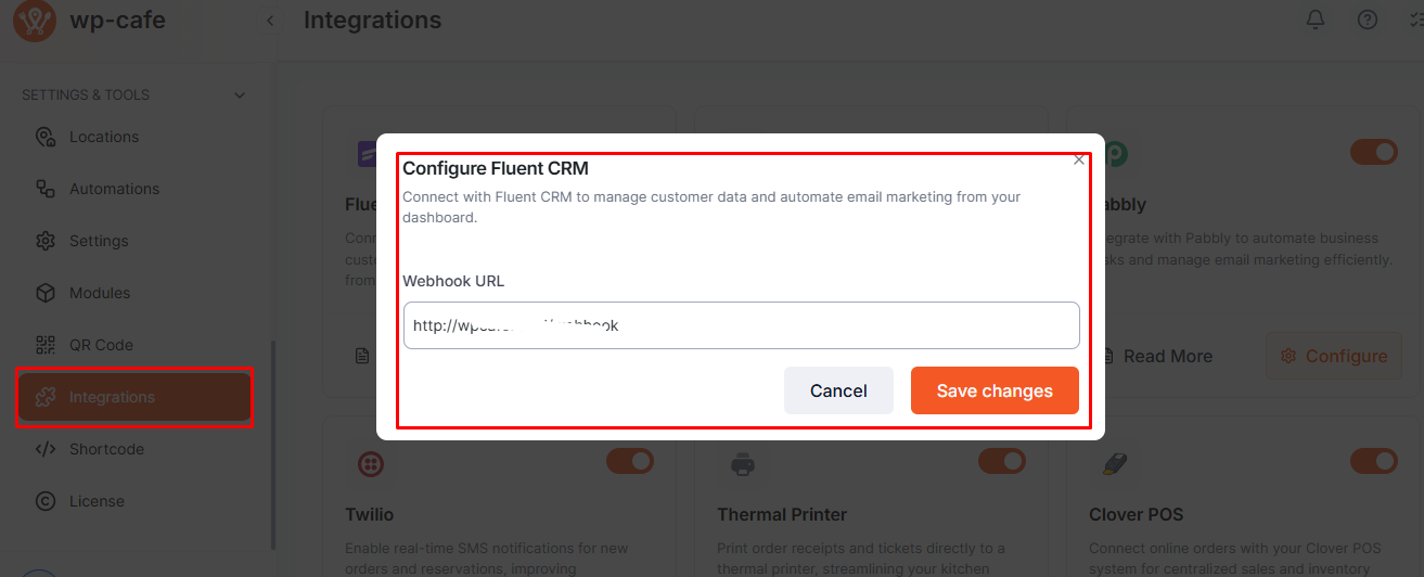 Go to WPCafe → Integrations, enable FluentCRM, click Configure, paste your webhook URL, and save.