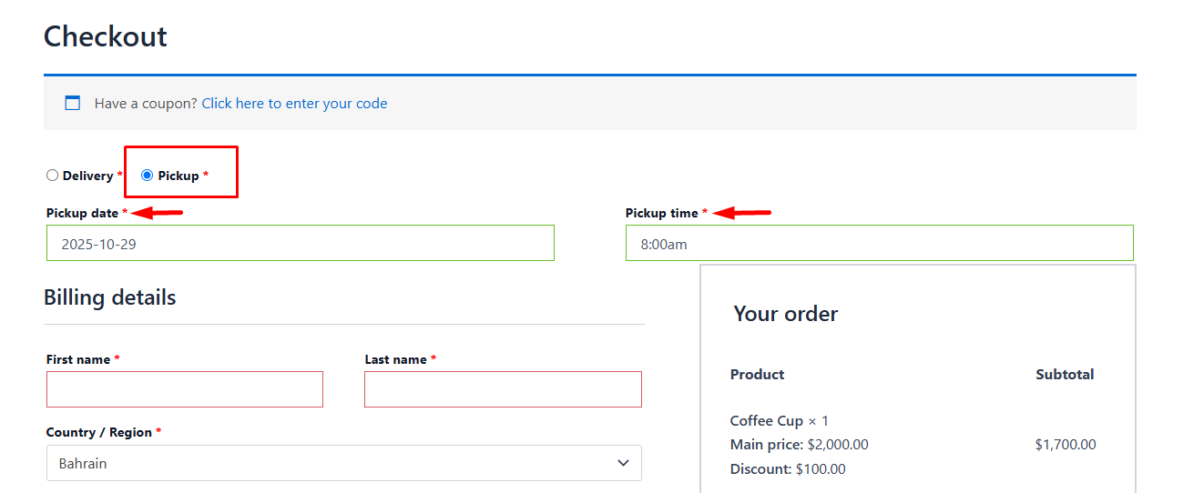 - Pickup Date & Time: Enable date and time selection at checkout.