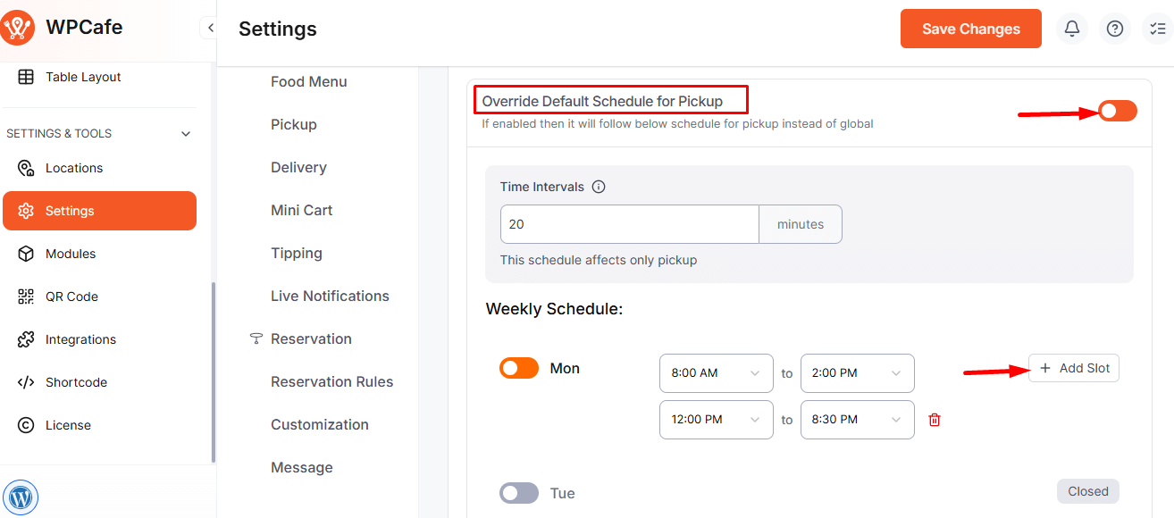 1. Go to WPCafe → Settings & Tools → Settings → Schedule.