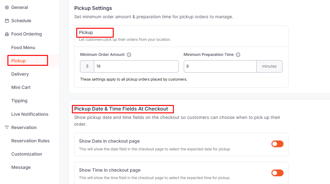 • Pickup Message: Customize messages or instructions for customers during pickup (e.g., location info, special notes, or preparation updates).