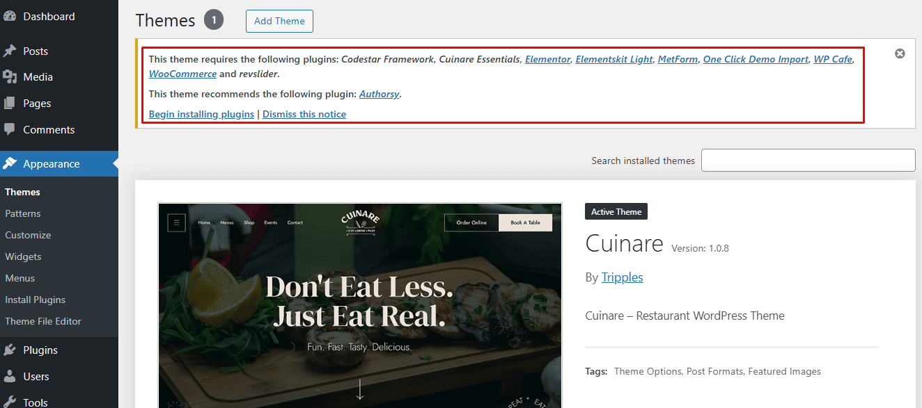 After activating the Cuinare theme, you will see and install all required plugins.