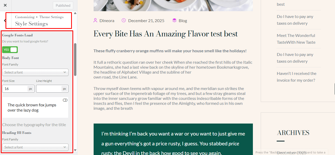 - Choose a font from Google Fonts or use the theme’s default fonts.