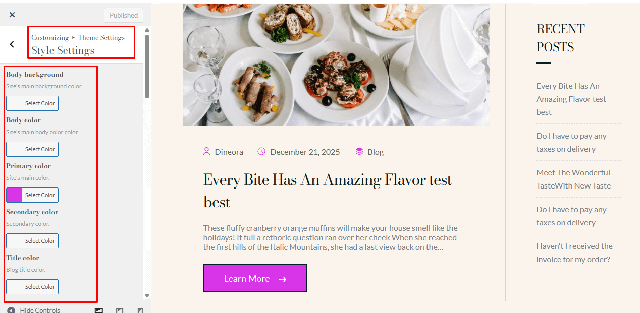 In Dineora, you can change colors and fonts using Theme Settings, Elementor, or custom CSS if needed.