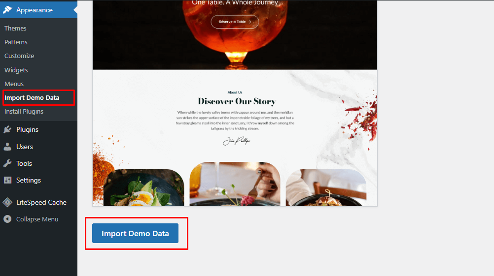 Navigate to Appearance > Import Demo Data, then select and install the demo content option that best fits your site setup.
